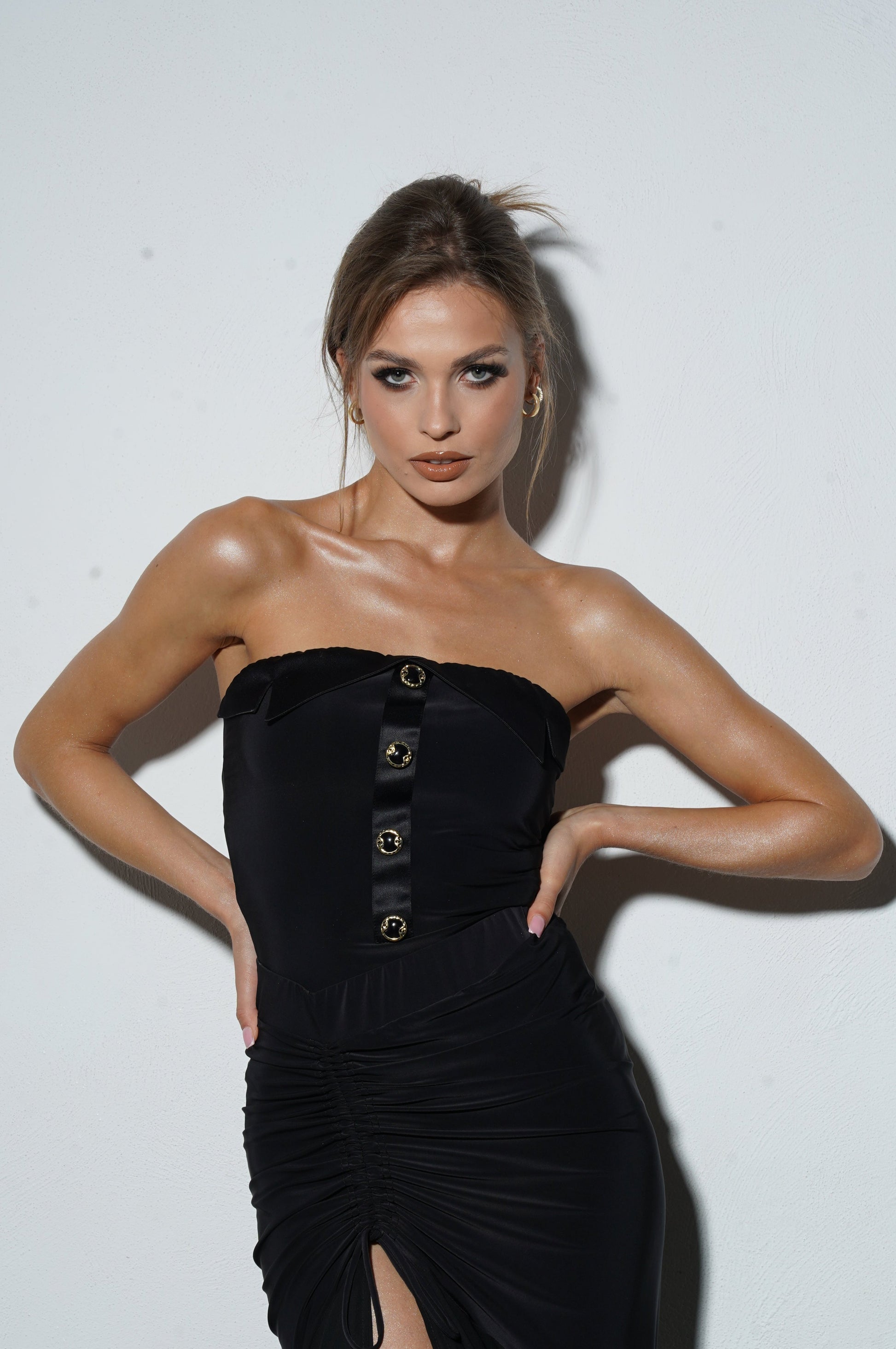 Express your independence and strength with theRebel 13bodysuit. Perfect for the dance floor, but also for evenings out! Stylish buttons and a satin jacket collar as the main decoration of the bodysuit.